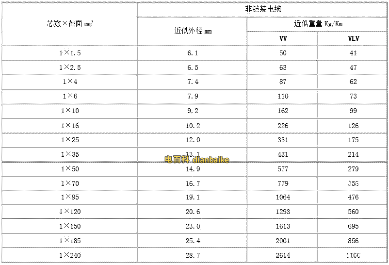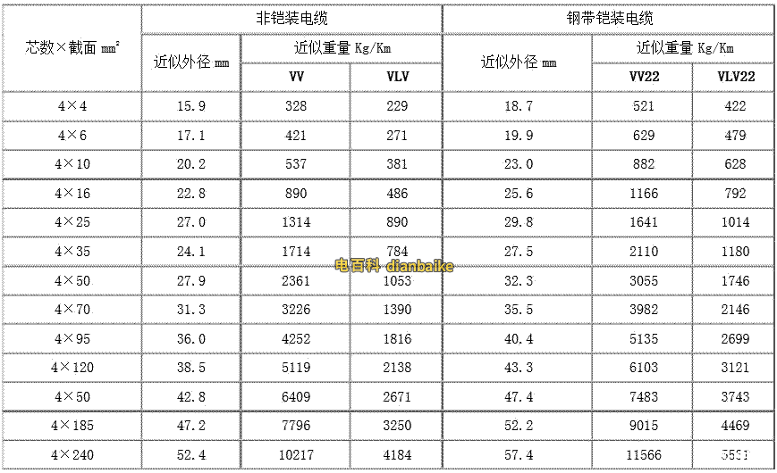 VV電纜外徑和VV電纜重量及VV電纜載流量對照查詢一覽表 電百科 2020-02-26 10:34:35 58 ℃ 鴻盛標牌 VV電纜在市場上使用非常成熟了,VV電纜選擇型號規格都要根據近似外徑和電纜載流量表等;下面就來介紹下VV電纜外徑和VV電纜重量及VV電纜載流量對照查詢一覽表。 一、VV電纜 二、VV電纜的近似外徑、重量表 1、單芯VV電纜 2、3芯VV鋼帶鎧裝與非鎧裝電纜 3、3+2芯VV鋼帶鎧裝與非鎧裝電纜 4、4芯VV鋼帶鎧裝與非鎧裝電纜 三、VV電纜載流量表 以上就是關于VV電纜的近似外徑、VV電纜重量、VV電纜載流量表問題請關注電百科,盜載必究。