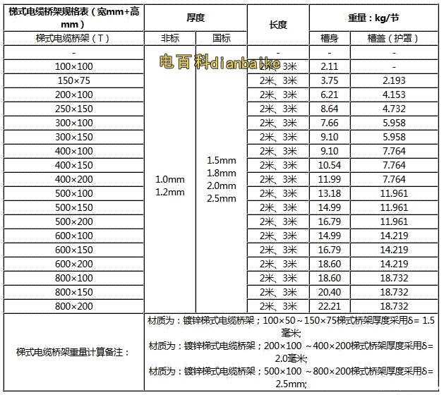 電纜橋架允許最小板厚:當橋架寬度B<100mm時 板厚1.0mm;100≤B<150時 1.2mm;150≤B<400時 1.5mm;400≤B≤800時 2.0mm;B>800時 2.5mm 。