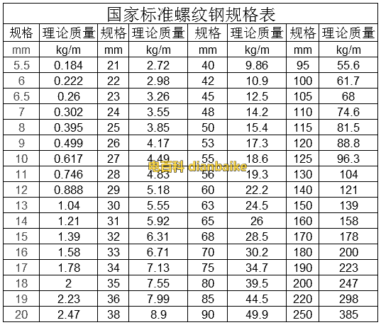 二、螺紋鋼規(guī)格型號表