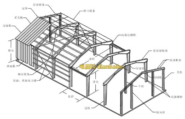 根據力學原理 門式剛架結構以柱、梁組成的橫向剛架為主受力結構,剛架為平面受力體系;為保證縱向穩定,設置柱間支撐和屋面支撐;剛架,剛架柱和梁均采用截面H型鋼制作,各種荷載通過柱和梁傳給基礎;支撐、系桿,剛性支撐采用熱軋型鋼制作,一般為角鋼;柔性支撐為圓鋼,系桿為受壓圓鋼管,與支撐組成受力封閉體系。更多關于鋼結構問題請關注電百科,盜載必究。