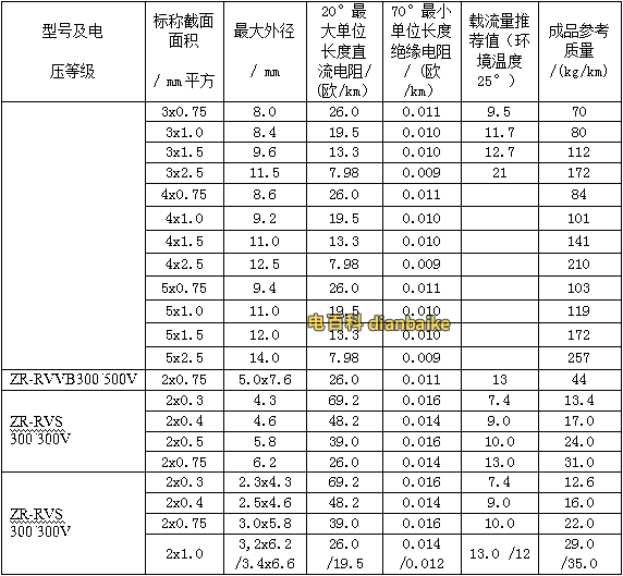 1、銅線BV、RV系列阻燃電線電纜的載流量表